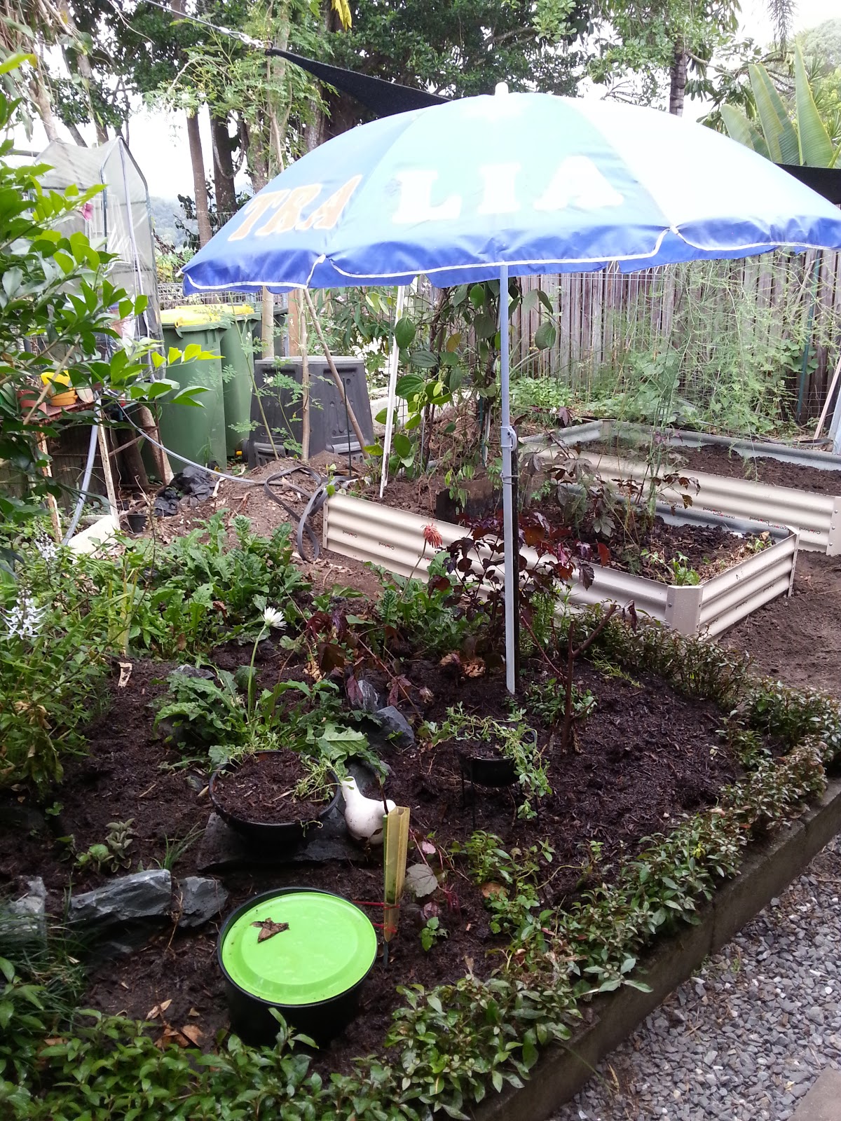 The gazebo did not make it out to the back, but the shade cloth works really well over the area, and in the end I have put the beds this way as I think it works better for the drainage. the bed to the left has the perennials - I severely cut back the peppercorn plant, and kept the barrier to stop it spreading into the forward part of the bed. I dug out the asparagus plants, and re-planted them, although the one big very productive plant I left and just built up around it - I hope this was an ok thing to do, but I really didn't want to disturb the roots.I planted out a few perennial rocket and parsley in the front of the bed, and sweet leaf against the divider The other bed has tons of compost and chicken manure mixed in with the soil, as I am going to move the compost tumbler and need to have it be almost empty in order to move it. This bed will be the bed I grow in mostly during the dry season, and for now I have planted a green manure crop.